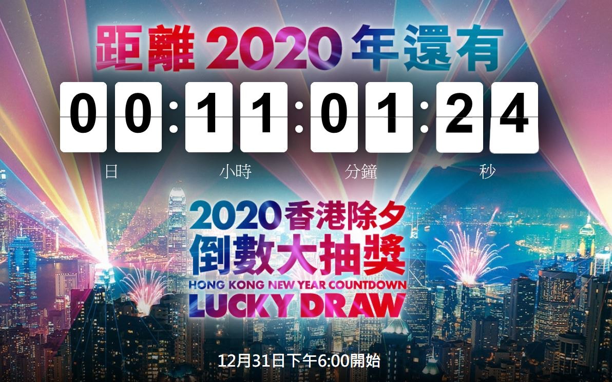 旅發局於除夕夜(12月31日)舉行「2020香港除夕倒數大抽獎」,在港市民及旅客均可爭奪總值400萬元獎品,當中包括國泰來回機票及iPhone 11 Pro Max等。